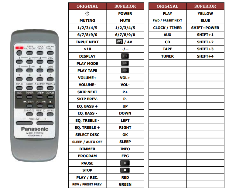 Zamiennikiem oryginalnego pilota Panasonic do tego urządzenia jest markowy pilot EMERX PReDATOR (po prawej), który ma inny wygląd (kolor, układ przycisków itp.), ale działa tak samo jak oryginalny pilot Panasonic. Pilot EMERX PREDATOR oferujemy jako tańszą alternatywę dla pilota oryginalnego lub dlatego, że ten oryginalny pilot nie jest już produkowany. Nie musisz w żaden sposób programować przesyłanego przez nas pilota. Zostanie skonfigurowany dokładnie dla Twojego urządzenia Panasonic, zachowując wszystkie funkcje.